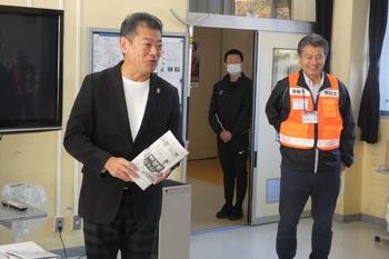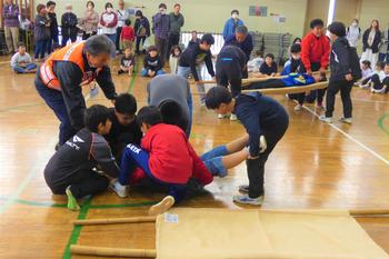 その後、児童は防災士の方のご指導のもと、新聞紙を使ったスリッパ作りに取り組みました。神達市長にもご来校いただき、子どもたちの活動の様子をご覧いただきました。続いて、防災士の方や常総警察署警備課長のお話を伺い、防災に関する正しい知識を学ぶことができました。