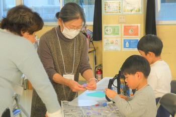 サンタさんが描かれた台紙に折り紙を貼り付け、リボンや松ぼっくり等を飾り付けて完成させました。自分だけの工夫を加えながら、どの子も楽しそうに取り組む姿が見られました。