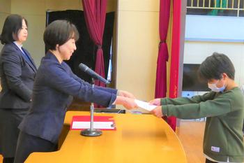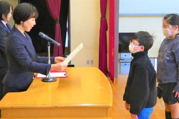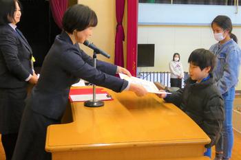 市文化祭作品展、手をつなぐ子供たち作品展、校内絵画展、校内持久走大会、読書感想文コンクールなど、それぞれの分野で努力を重ね、成果を収めた子供たちに賞状を手渡しました。
