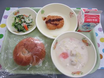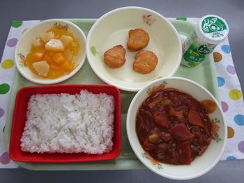 11月14日(金) ハヤシライス(麦ごはん ハヤシシチュー) 発酵乳 チキンナゲット(2.2.2.3) フルーツみかんゼリー和え 今日は発酵乳です。「ヨーグルト」や「飲むヨーグルト」、「ヤクルト」「ジョア」などは、すべて発酵乳の仲間です。発酵乳は、牛乳に「乳酸菌」いう体によい菌を加えて、発酵させて作ります。発酵乳が体によいと言われる一番の理由は、この乳酸菌がみんなの腸で大活躍してくれるからです。腸の中には、体によい働きをする「善玉菌」や、悪い働きをする「悪玉菌」など、たくさんの細菌が住んでいます。これが「腸内細菌」です。乳酸菌は、この腸内細菌のバランスを整える善玉菌を増やし、腸内環境をよくしてくれます。腸内環境が整うと、おなかの調子が整ったり、免疫力が高まって病気に負けない体を作ったりします。発酵乳には、みんなの骨や歯を丈夫にするカルシウムもたっぷり入っていますね。 |