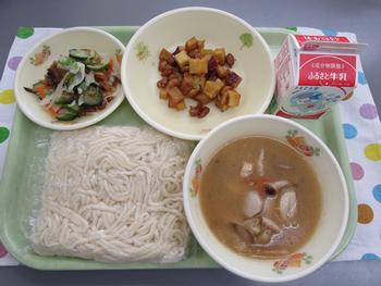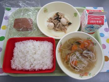 ~給食パクパク週間・茨城をたべようWeek~ ~ 郷土料理(茨城県) ~ 11月17日(月) つけけんちんうどん(ソフトめん つけけんちん汁) 牛乳 さつまいもと大豆の揚げ煮 キャベツとしらすのサラダ(和風ドレッシング) 今週は「茨城をたべようWeek」です。今週の給食は、常総市や茨城県でとれた食べ物をたくさん使っています。今日の常総市産の食材は、大根、ねぎ、キャベツ、きゅうり、さといも、さつまいもです。茨城県産の食材は、ソフトめん、鶏肉、油揚げ、牛乳、しらす、ごぼう、しめじ、もやし、きくらげです。みなさんが住んでいる地域ではどんな食べ物が作られているのか、給食から調べてみるのも素敵ですね。 また、今日から「給食パクパク週間」です。子どもたちは自分の目標が達成できるように、意欲的に給食を食べていました。 |