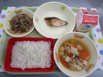 ~ 給食パクパク週間・茨城をたべようWeek ~ 11月18日(火) ごはん 牛乳 いなだの色付け ごぼうのピリ辛味噌炒め かぶのみぞれ汁 今日の常総市産の食材は、ごはん、にんじん、かぶ、ねぎ、とうがんです。茨城県産食材はいなだ、豚肉、鶏肉、豆腐、牛乳、ピーマン、ごぼう、しめじ、こんにゃくです。 今日の給食の魚は「いなだ」です。いなだには、みなさんの頭の働きをよくしたり、血をサラサラにして体を元気にしてくれたりする「DHA」という栄養がたっぷり入っています。また、いなだは大きくなるにつれて名前が変わる「出世魚」という、おめでたい魚です。今日は中くらいの大きさの「いなだ」ですが、もっと大きくなると「ぶり」という名前になります。味にクセがない魚で、ごはんによく合う味付けです。魚が苦手な人も、一口はチャレンジしてみましょう。 今日の「かぶのみぞれ汁」には常総市産のかぶが使われていますが、常総市の農家の方が納品してくださったかぶは、とっても『おおきなかぶ』でした!隣に並べたみかんとは比べ物にならないくらいの大きさですね! |