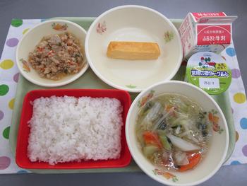 11月6日(木) ごはん 牛乳 鶏肉のバーベキューソース 炒り豆腐 じゃがいもの味噌汁 今日は炒り豆腐についてです。炒り豆腐は、くずした豆腐とにんじんやひき肉などの具材を、だしと調味料で一緒に炒め煮にした、昔ながらの和食料理です。 いろいろな料理に登場する豆腐は、私たち日本人にとって欠かせない大切な食材です。豆腐は、大豆からできています 。大豆を水につけてすりつぶし、煮てから絞った「豆乳」に「にがり」を加えて固めると豆腐になります。大豆と同じように、体を作るたんぱく質が多く、骨や歯を強くするカルシウムも含まれています。 たくさんの具材と豆腐でつくる、やさしい味わいの炒り豆腐をおいしくいただきましょう。 |