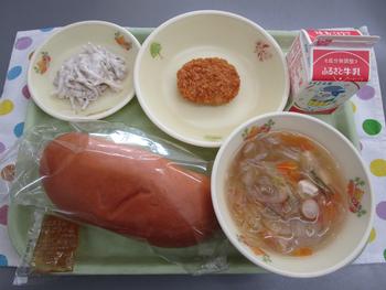 11月26日(水) コッペパン(りんごジャム) 牛乳 豆乳コーンコロッケ ごぼうサラダ ウインナーと白菜のスープ 今日はコッペパンにりんごジャムをつけて食べましょう。ジャムは、果物と砂糖を煮詰めて作られます。とれる季節が決まっている果物でも、ジャムにすることで腐りにくくなり、長い期間楽しむことができます。また、果物に含まれる「ペクチン」という成分は、煮詰めることで体に吸収されやすくなり、おなかの調子を整えるのを手伝ってくれます。 実は、秋から冬にかけて、りんごがおいしい時期です。「1日1個のりんごは医者いらず」ということわざがあるくらい、りんごにはみんなの体を元気にするパワーがいっぱい詰まっています。給食ではりんごジャム、おうちでは旬のりんごをおいしくいただきましょう。 |