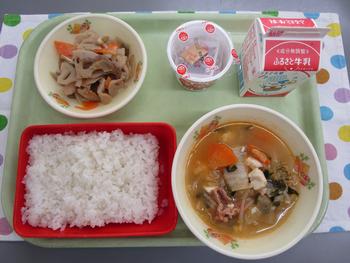 11月27日(木) ごはん 牛乳 納豆 煮合い キムチ鍋 今日は茨城県の郷土料理「煮合い」です。煮合いは、水戸市のあたりで昔から大切にされてきた郷土理です。「煮合い」という名前は、たくさんの野菜やきのこ、油揚げを一緒に「煮て」、最後にお酢を加えて「あえる」ことからついたと言われています。もともとは、お正月やお祝い事など、人が集まるハレの日(特別な日)には欠かせない、大切なおもてなし料理でした。普通の煮物と違って、最後にお酢を入れるのが「煮合い」の大きな特徴です。酸っぱい味には、食欲を出す働きがあります。また、お酢のおかげで食べ物が腐りにくく、作った後も味が変わりにくいので、長い間保存することができます。 さらに、茨城県といえば「納豆」ですね!納豆は、よ~くかき混ぜて、ネバネバをたくさん出すと、よりおいしくなるそうですよ。独特のにおいがあるので、苦手な人には辛いかもしれませんが、「おいしい!」とごはんを完食している児童が多かったです。 |